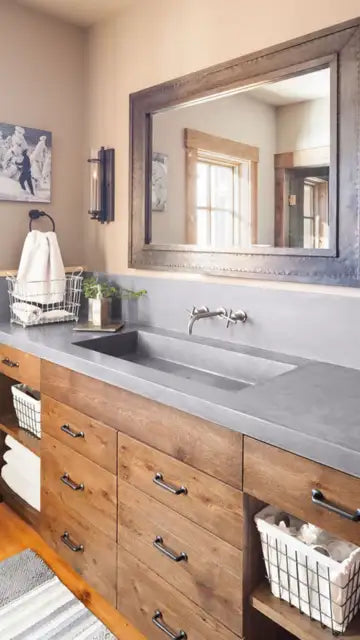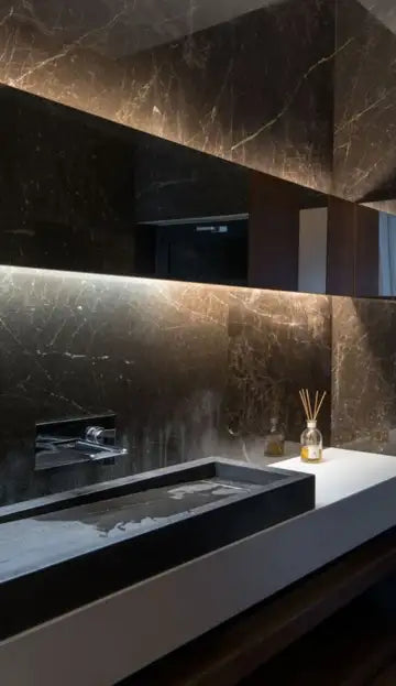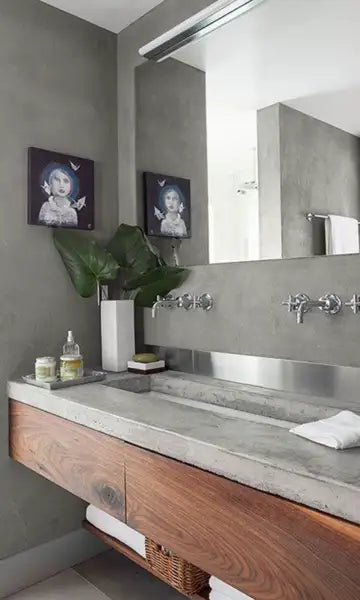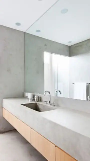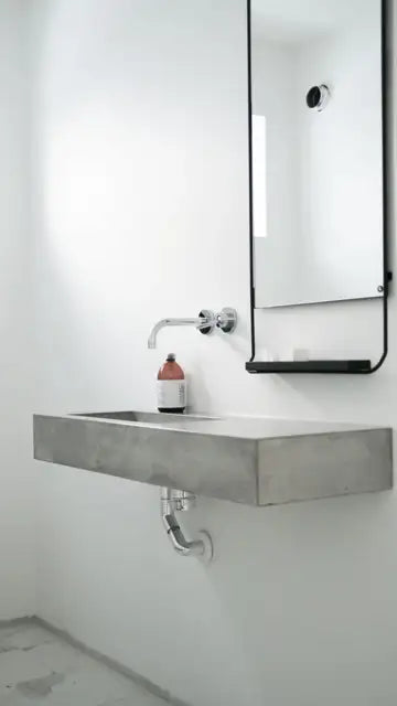 Our signature integrated vanities are a testament to this, offering our clients the opportunity to infuse their spaces with distinct character and style. While we offer a variety of materials—including stone, concrete, and stone composite—we highly advocate for stone composite. Its remarkable adaptability, extensive colour palette, and lightweight nature make it an ideal choice, especially for sleek floating vanities that require no floor support.